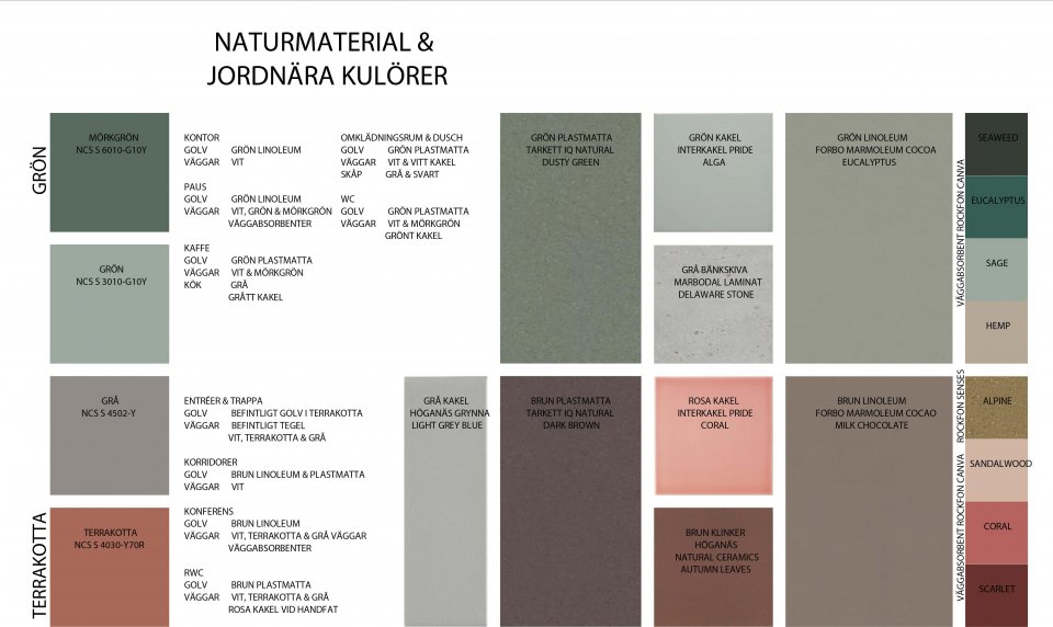 Invändigt har färgsättningen inspirerats av det befintliga terrakottafärgade klinkergolvet i entrén. Väggarna i entrén och konferensrummen har målats i en modern terrakottanyans, medan kontor, pausrum och omklädningsrum fått en lugnande grön färg som komplement.
